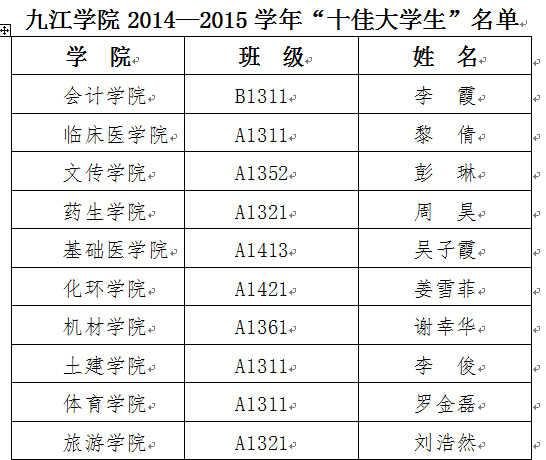 根据九江学院“十佳大学生”、“十佳勤奋学习标兵”评选标准,经本人申请,二级学院审核、推荐,学校“十佳大学生”、“十佳勤奋学习标兵”评审委员会评选,拟授予以下20名同学2014—2015学年“十佳大学生”、“十佳勤奋学习标兵”称号,现予以公示: