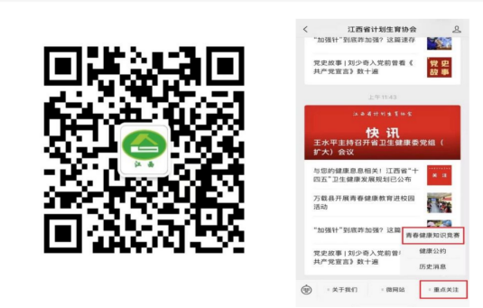 通过手机扫描微信二维码,关注“江西省计划生育协会”微信公众号,点击公众号下方菜单“重点关注”,打开“青春健康知识竞赛”进入答题页面,填写信息后答题。此次活动举办方将对参赛者的信息保密。