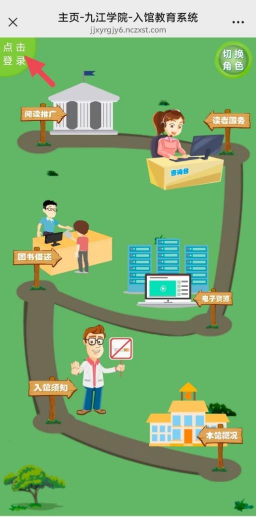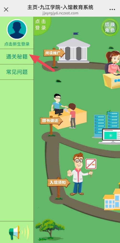 关注“九江学院图书馆”微信公众号(账号“jjxy_tsg”),点击右下角“读者服务——入馆教育”进入游戏闯关页面。