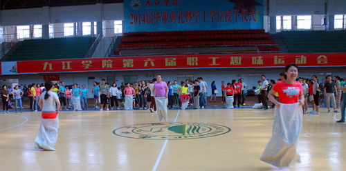 “跳绳接力”需边跑边跳绳一步一步向前迈进,有较高的技巧性;“袋鼠跳”必须做到双脚和袋子合一向前跳动,才能取得较好成绩;“绑腿跳”需要所有选手步调一致,倾尽全力,丝毫不能松懈,才能保证团队的最佳成绩。“搭桥过河”需要团队每个人手脚灵活,快速移动目标,一步一步向终点靠近,这既要考验队员的机智、灵活,又要考验团队的精诚合作和耐心。比赛不仅仅是竞技,更是娱乐。比赛现场,广大教职工兴致勃勃、积极主动地参加到各项比赛中。比赛在轻松而又紧张的氛围中持续了近两个小时,4个赛场都呈现出队员们奋力拼搏,观众们呐喊助威,大家欢天喜地的热闹场面。