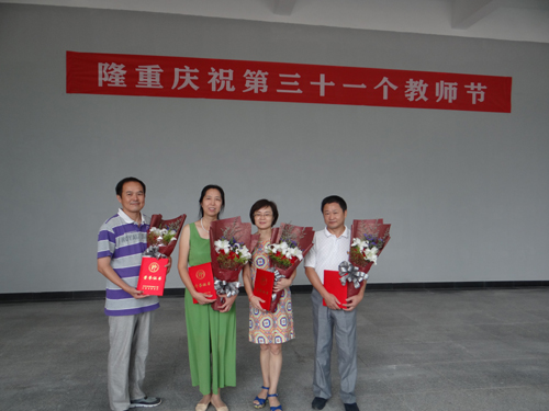 在新落成的教职工活动中心一楼大厅,甘筱青校长等校领导向学校从教三十年以上教师代表颁发了荣誉证书和鲜花,并向他们致以节日的问候。
