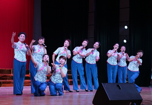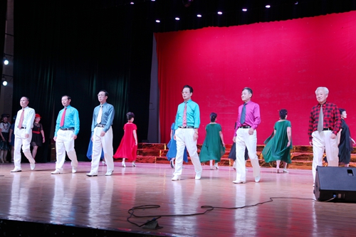 汇演结束后,吴桃娥和相关部门负责同志走上台慰问演职人员,并合影留念。