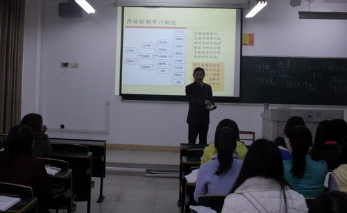 11月18日上午,校纪委书记魏立平来到立信楼208教室,与会计学院B1329班和B1331的同学们一起听取了由蒋朝阳老师讲授的《内部控制》课程。 会计学院副院长张国伟一同听课。
