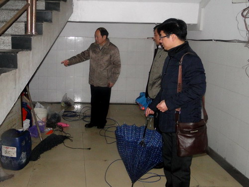 纪副校长一行又来到文友楼察看,在文友楼对面的濂溪大道上,由于路面不平,路面被积水淹没,影响师生出行和交通安全。纪副校长要求基建、国资等部门及时处理,消除安全隐患。在文友楼门前和文友楼一楼楼梯口,纪副校长发现有垃圾随意堆放,影响校容校貌,他要求后勤和教室管理部门加强管理,及时清理垃圾。在文友楼一、二楼之间的墙上,有一个楼栋电表箱,由于墙体渗水,电表箱里面的设备已经烧坏,文传学院多次向有关部门反映,但一直没有解决。对于这个安全隐患,纪副校长要求党办通知后勤、水电、国资、基建等部门协商,立即行动,尽快解决这一问题,消除安全隐患。纪副校长又来到理学院办公场所察看,理学院相关负责人反映,学院办公场所太过分散,不便于工作,希望办公场所能相对集中,以便于更好的工作。