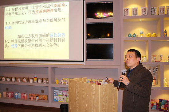 讲座中,李军政博士以“企业知识产权风险管控”为主题,对企业知识产权的概念、种类、归属、特点等内容进行了阐述,从对外技术合作、新产品开发、人力资源管理、市场推广、发现侵权与被控侵权时的处理方式等五个方面进行了讲解。每个方面又从知识产权归属、风险来源、上下游企业的风险回避、案例讲解等角度做了详细的讲解说明。