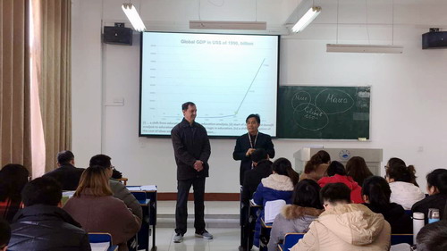 12月16日上午,杨耀防副校长到义丰楼听取经济与管理学院商A1481中英合作班外教Andrei Munteanu 的国际经济合作课程。国际交流交流学院负责人帅式毅和经济与管理学院副院长项益才一同听课。