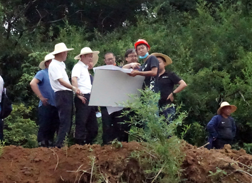 赵伟一行从新校区建设指挥部出发,沿着平整出来的小路进行现场踏勘。一年多来,他多次来新校区建设用地调研指导工作,这里的每一棵古木大树,每一片绿地植被,每一处地形地貌,他都很熟悉。对照施工设计图纸,他一一细致地叮咛设计单位和施工单位,这里要按照现有地貌再次精准调整方案,因地就势做一些微型景观;这些古树一定要保护好;移栽树木要考虑好树与人的距离这些细节问题,距离人远了缺少亲和力,太近了要注意保护;这块植被不要破坏了,低洼地带就架设小桥......