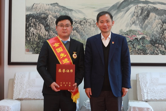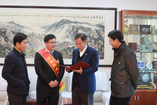 赵伟对谭翊泉荣获全国先进工作者表示祝贺,称赞他为学校争得了荣誉,赞扬他在担任我校驻武宁县东山村第一书记及被村民选为村支部书记的八年时间里默默奉献、尽职履责、勇于担当,带领东山村民勤劳致富,把贫困落后的小山村打造成美丽乡村。