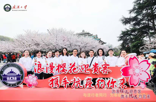 从酒店到武汉大学赏樱的路上,依旧是警车开道、市民驻足招手,医护代表一路唱着《我和我的祖国》、《小白杨》,饱含深情地表达着对这片土地深沉的爱和白衣执甲的无怨无悔。武汉大学精心遴选出1500余名在校师生,为医护人员提供全程志愿者专属服务,除了送上富有武汉特色的抗疫勋章,还特别给医护人员“送上一朵小红花”。