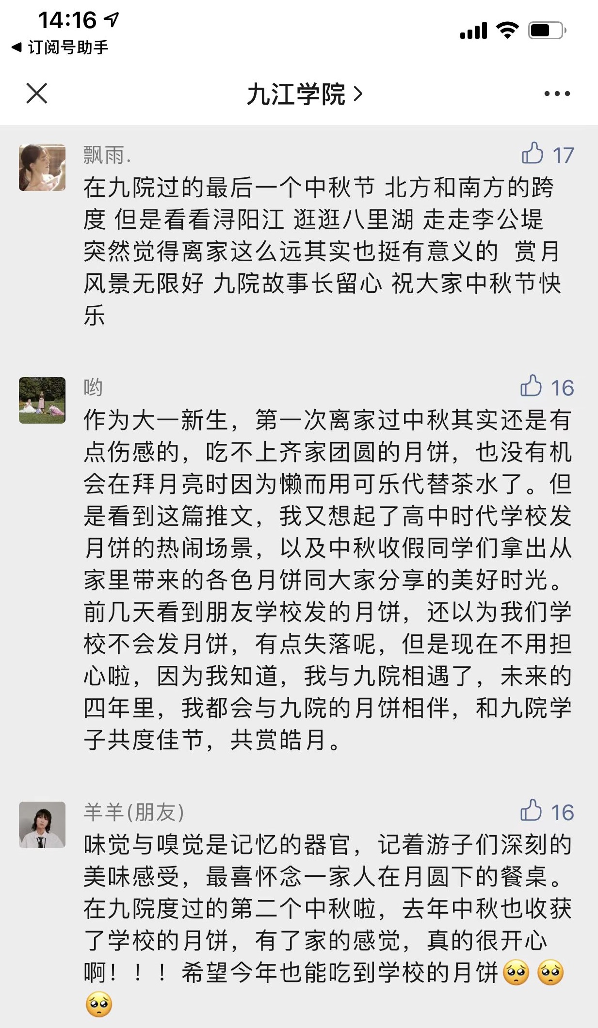 “每次传统节日,学校都会精心准备福利,即便不能回家,也让我感受到了温暖和快乐!”“作为一名大一新生,第一次离家过中秋,看到朋友学校发的月饼还以为我们学校不会发月饼,有点失落,但现在不用担心了,因为我知道,我与九院相遇了,未来四年里,我都会与九院月饼相伴,和九院学子共度佳节,共赏皓月” ……在九江学院微信公众号和九院后勤公众号里一条条温馨留言,感动着每一个九院人,这些留言都源于这几日我校后勤管理处饮食服务中心开展的一场“佳节不忘光盘礼,浓情更惜月饼情”活动。这是学校后勤管理处又一次在我国传统节日为师生发放福利,也再次表明九院后勤干部员工们正用实际行动聚焦立德树人根本任务,用心用情为九院师生办好实事。