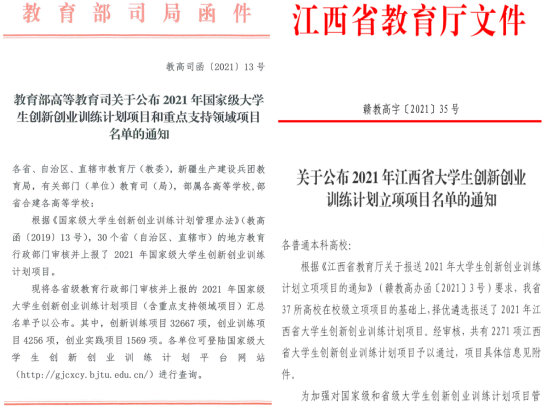 根据《教育部高教司关于公布2021年国家级大学生创新创业训练计划项目和重点支持领域项目名单的通知》(教高司函〔 2021〕13号)和《关于公布2021年江西省大学生创新创业训练计划立项项目名单的通知》(赣教高字〔2021〕35号)公布结果,《“双凝胶互穿法”制备多孔碳材料及其电化学储能性能研究》等30个项目获国家级项目立项,《基于佳点集和莱维飞行的蜉蝣优化算法研究》等50个项目获省级项目立项;在学校原有基础上,我校国家级和省级大学生创新创业训练计划项目立项总数再上新台阶,共计80项。