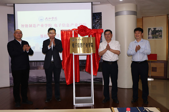 5月21日,九江学院智能制造产业学院、电子信息产业学院签约揭牌仪式在行政楼一号会议室举行。九江经济技术开发区党工委书记柯尊玉、管委会主任戴炜,九江学院党委书记赵伟,校长陈小林,副校长陈春生、严平等出席签约揭牌仪式。仪式由陈小林主持。