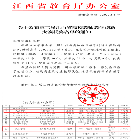 近日,江西省教育厅公布了第二届江西省高校教师教学创新大赛获奖名单,我校选派的机械与智能制造学院王英惠教学团队和经济学院张敏教学团队在众多参赛教师团队中脱颖而出,分别荣获正高组和讲师及以下组二等奖。
