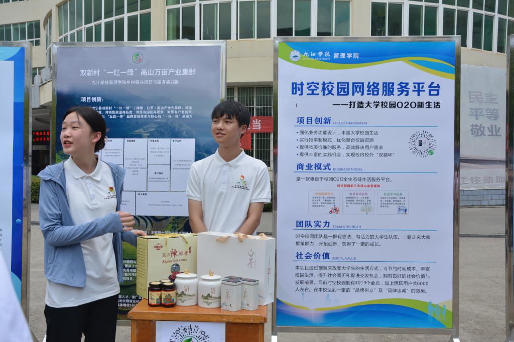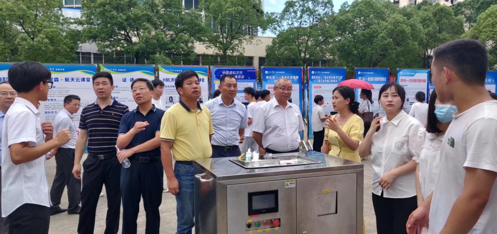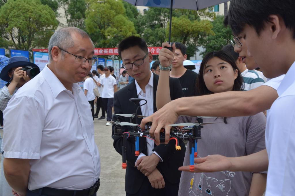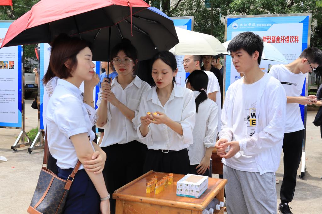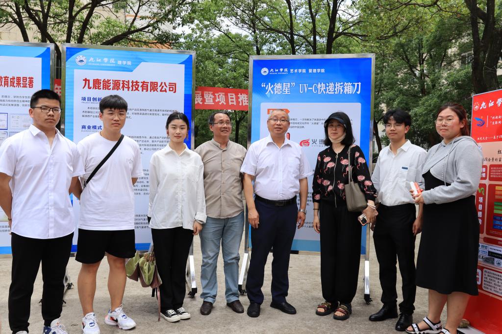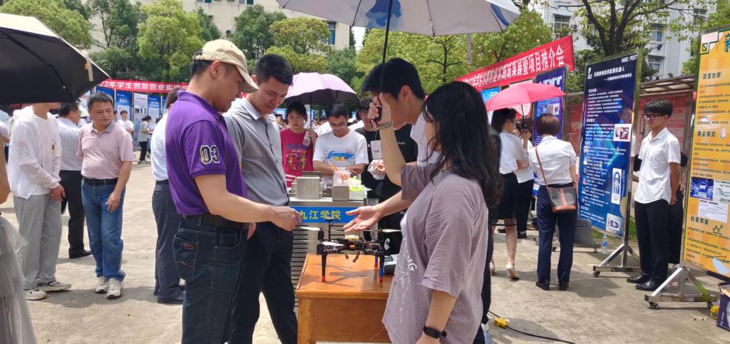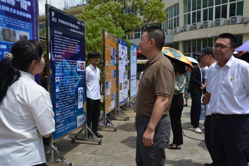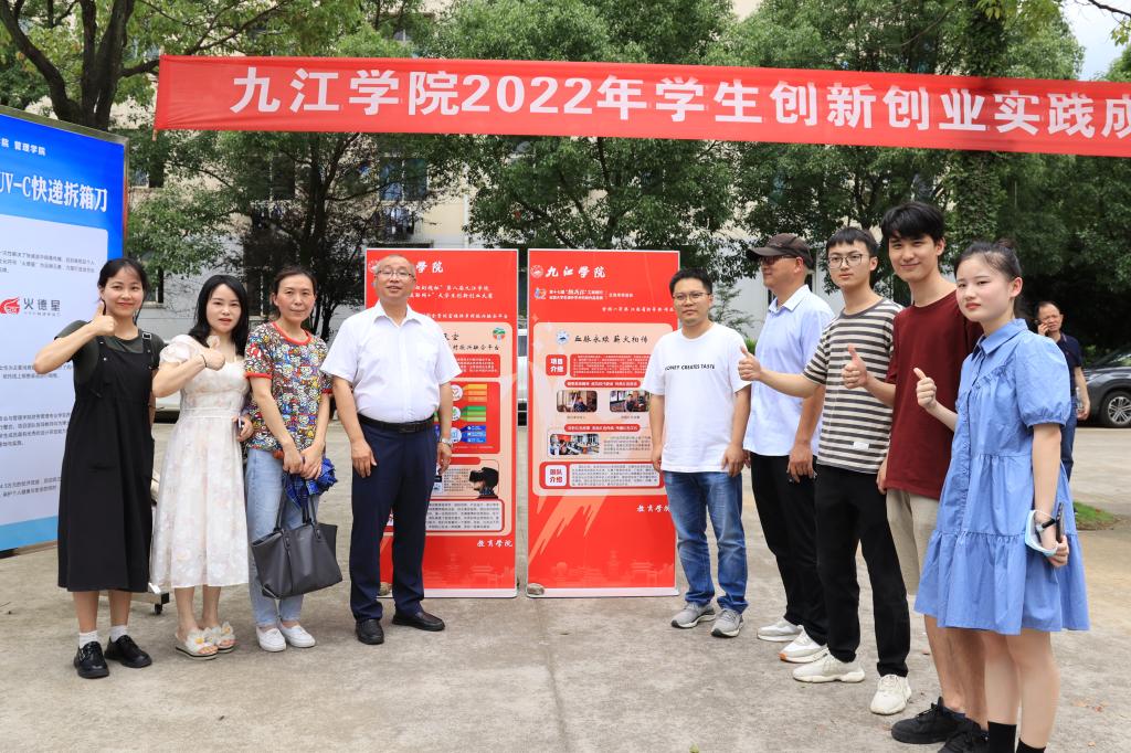 为贯彻落实中共中央、国务院有关劳动教育和促进大学生创新创业的有关精神,进一步提升大学生创新创业能力,激发学生创新创业热情,6月21日,我校在学校三食堂广场举行了2022年学生创新创业实践成果展暨项目推介会,67块展板、17个学院的学生创新创业成果在推介会上亮相,吸引了众多师生围观。校长陈小林,副校长陈春生、严平出席成果展并与师生现场研讨创新创业实践成果。来自北京、广州、南昌和九江的知名投融资公司、银行负责人和专家周洛宏、庄岩、江传明、甘文斌等15人应邀观展并进行了项目对接。