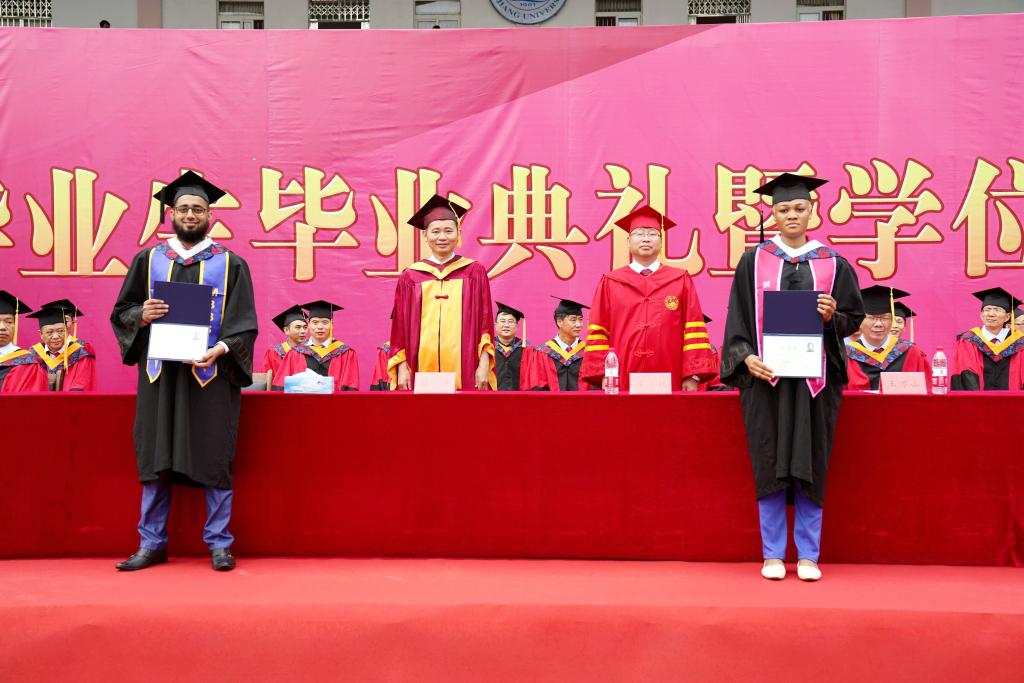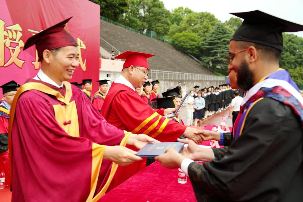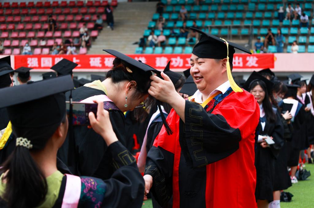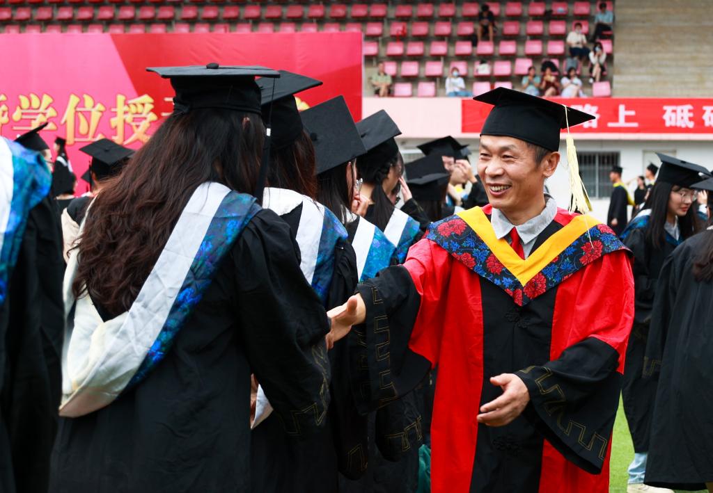 在学位授予仪式上,校党委书记赵伟、校长陈小林等校领导为毕业生代表颁发毕业证书,校学位评定委员会委员走到毕业生中间,为九院学子一一拨穗正冠,祝愿他们前程似锦、鹏程万里。