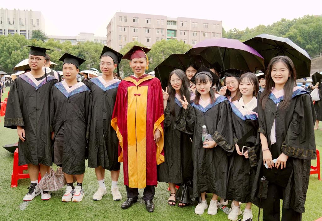 毕业典礼在2022届全体毕业生们欢呼声中结束,赵伟、陈小林等校领导、校学位评定委员会委员冒雨来到同学们中间,与他们合影、握手、话别。