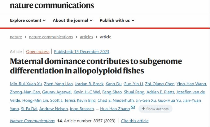 此次研究成果由我校张化浩&张小谷教授团队牵头,联合中国农业科学院深圳农业基因组研究所、密西根大学、德克萨斯州立大学、周口师范学院、北京格致博雅生物科技有限公司、加利福尼亚大学伯克利分校、不列颠哥伦比亚大学、西南大学、马克斯·普朗克植物育种研究所、九江市农业科学院、汤普森研究所及维尔茨堡大学等10家单位,在国际重要学术刊物“Nature子刊”《Nature Communications》在线发表,研究成果为“Maternal dominance contributes to subgenome differentiation in allopolyploid fishes”,是我校水产研究团队高水平论文的又一个重要突破。