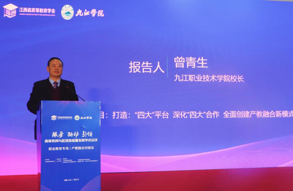 曾青生作了题为《打造“四大平台”,深化“四大合作”,全面创建产教融合新模式》的报告。报告以九江职业技术学院的办学实践为蓝本,阐述了“平台+合作”的产教融合新模式。