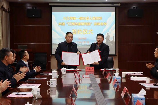 2月2日,九江学院与修水县人民政府共建“江西诗派研究院”战略合作协议签约仪式在九江学院成功举行。九江学院党委副书记、校长陈小林和修水县委副书记、县长刘婕出席会议并致辞。九江学院党委委员、副校长李松志主持仪式并代表九江学院签约。