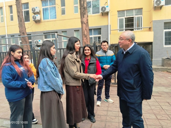 1月22日上午,校长陈小林、副校长雷志强一行到丹枫园校区24栋公寓,看望慰问寒假期间留校的留学生代表,为他们送上新春的祝福和学校的关怀。