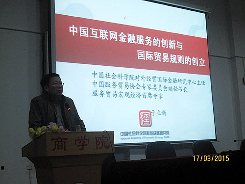 为加快推进国际商务硕士点申报工作和国际贸易学重点学科建设,3月17日晚,经济与管理学院邀请中国社会科学院于立新研究员来校作了题为《中国互联网金融服务的创新与国际贸易规则的创立》的学术讲座。经济与管理学院国际经济与贸易、金融学等专业师生共计300余人到场聆听。讲座由国际贸易教研室主任杨盛标博士主持。