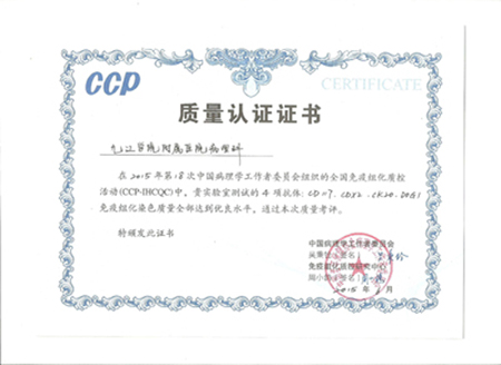 近日,临床医学院/附属医院病理科在2015年第18次中国病理学工作者委员会(CCP)组织的全国免疫组化质控评比中取得优异成绩,获得CCP颁发的质量认证证书。这是临床医学院/附属医院病理科自2011年以来第三次参加此项评比活动,三次免疫组化染色质量均达到优良成绩,标志着临床医学院/附属医院病理科在该领域研究和发展一直保持领先水平。