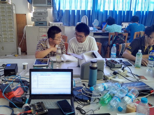 在校领导、学生处的关心支持下,电子工程学院师生们克服暑期天气炎热等不利因素,从7月1日开始到8月11日,先后安排8名教师对选拔的32名参赛队员开展为期42天的系列培训。培训期间,指导教师全天候坐班进行辅导答疑,帮组学生进行训练提高。同时对学生做好认真考勤,训练之余了解学生去向,确保学生在校安全。培训期间,虽然天气炎热、实验室条件有限,但是参赛同学乐观向上,纷纷表示,要利用这难得的机会,提高自己、证明自己、挑战自己。