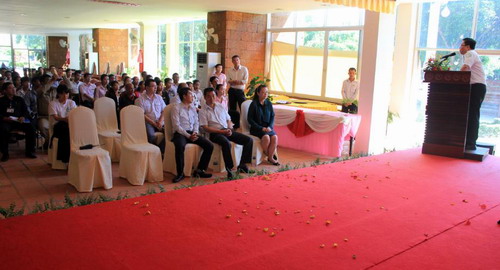 唐勇总经理代表民俗文化村全体同仁感谢孔子学院对他们的大力支持和帮助。他指出,目前中国到柬埔寨旅游的游客增长率已位居第一,高达20.95%;并且柬埔寨旅游部和中国国际旅行社携手力争在两年内实现百万中国游客的目标。柬埔寨民俗文化村作为暹粒省著名景点之一,势必要做好有关接待准备。提高职员的中文服务水平和服务能力,更好地展示与传播柬埔寨民俗文化,更好地推动中柬两国民间文化交流从而进一步加深中柬两国友谊是我们的目标和责任。今天孔子学院伸出援助之手,相信我们的目标一定能实现。他要求广大学员一定要认真听课并能够灵活应用,对学习汉语优秀的员工公司将给予精神和物质的奖励。