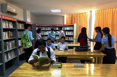 亚欧大学专门为“大使图书角”重新装修了一间中文图书室,自“大使图书角”开放以来,因为中文书籍数量众多,总类丰富,吸引了大批中文系学生前来图书室借阅书籍。“大使图书角”的设立受到了孔子学院亚欧大学中文系学生的广泛关注和喜爱。亚欧大学自2012年8月10日同孔子学院合作开设的首个中文系以来,本着培养柬埔寨本土汉语教师及高级中柬翻译人才的宗旨,并积极开展职业管理人才的培训,已成功培养出了一批批优秀懂中文的人才。