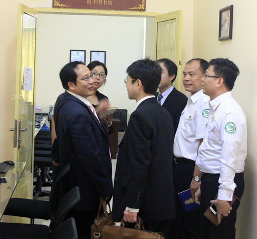 代表团一行在谢莫尼勒阁下和中方院长帅式毅的陪同下参观孔子学院并进行了会谈。谢莫尼勒阁下向来宾介绍了6年来艰辛的办学历程,孔子学院2009年只有借用的一间小办公室,2011年在柬埔寨华人华侨的支持下,有了自己的大楼;孔子学院注重文化介绍和交流,每周均会举办文化活动;在孔子学院创办之前,学汉语只是做生意人的事,柬埔寨官员对汉语和中国知之甚少,2010年孔子学院官员班的第一次汉语课是时任大使张金凤主讲的,现在我们有部分官员班汉语学员都能做翻译了;尤其是2013年亚洲孔子学院联席会议期间,洪森总理特别邀请会议在总理府大楼会议室召开,并表示会全力支持孔子学院的工作;孔子学院现有教师75名,2015至2016学年在校生逾万人,2016年孔子学院也会稳步加强硬件和软件建设,努力做好示范孔子学院的建设工作。