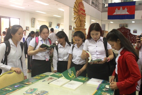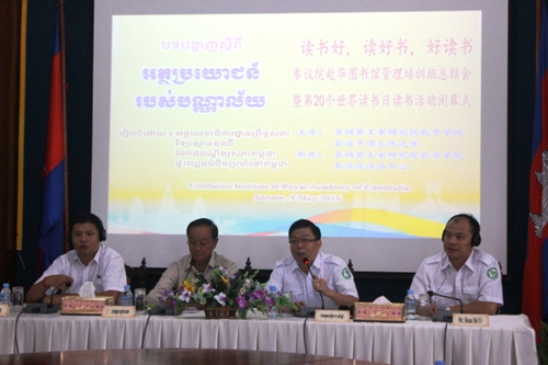 据悉,孔子学院组织的2016年读书日读书活动历时一个月,先后组织承办了电子图书馆操作使用培训班、《诺罗敦·西哈努克时代的柬中关系》读书交流会、孔子学院汉语中心校长团赴厦门参加“中国—东盟中学校长论坛” 座谈会、第九届中国—东盟教育交流周留学中国(贵州)教育展及新知书局图书展等。(吴翠凤)