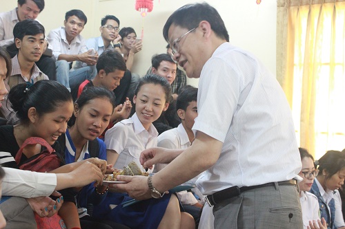 讲座的最后,贵州师范学院李存雄校长为学生们送上了祝福满满的粽子,贵州师范学院文学院院长吴俊教授还为学生们带来了一段激情昂扬的演讲,他说:希望屈原的悲剧不会重演,希望中柬友谊天长地久。