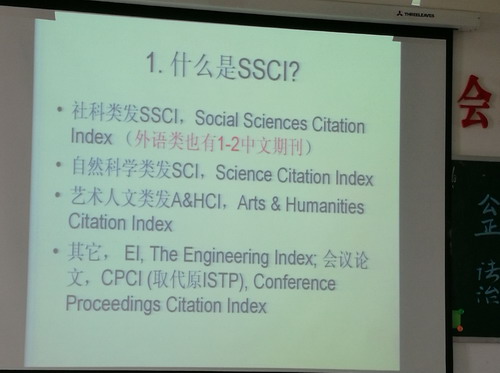 吴群老师的汇报主要从如何发SSCI文章和怎样成功申报国家级课题两个方向展开。其中,介绍关于如何发SSCI文章时,吴老师分别从1. 什么是SSCI? 2. 怎样发SSCI文章 3.具体的投稿过程 4.发SSCI文章的经历等四个方面做了详细介绍。在介绍怎样成功申报国家级课题时,吴老师以自己申报成功的课题“信息化时代的使用智能手机开展英语教学模式有效性探讨研究”为例,给各位老师普及了国家社科课题评审的四大环节:省里初稿、初审、函评、会评。同时也讲解了国家社科选题、论证和研究基础等三个方面的评分标准。