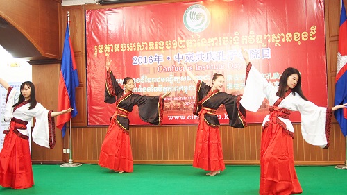 23日下午,在柬埔寨王家研究院礼堂举办了以“承古开今共庆孔院十二载,继往开来喜迎中柬好风采”为主题的“孔子学院日”庆祝活动。柬埔寨孔子学院理事长、王家研究院院长克洛媞达院士在庆祝会上致辞,她说,孔子是中国伟大的思想家、教育家和儒家学派创始人,孔子的思想是中国文化的重要组成部分,对中国和世界产生了深刻的影响。她特别强调,中柬两国自古友谊深厚,坚不可摧,中国永远是柬埔寨的好伙伴、好兄弟,孔子学院也将继续在两国友好关系的发展中发挥作用。随后,汉语教师志愿者表演了中国茶艺、中国功夫、中国乐器、中国舞蹈等带有浓厚中国色彩的节目,孔院师生一起欢庆孔子学院日。志愿者老师的精彩表演,赢得了观众的阵阵掌声。