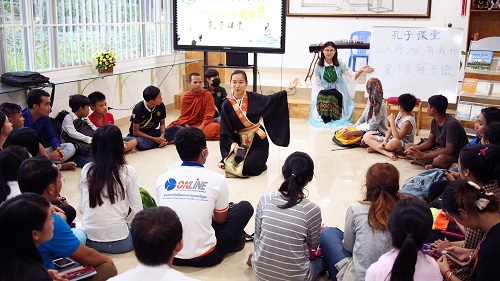 此外,柬埔寨孔院本部及各教学点还开展了丰富多彩的汉语教学和文化推广活动,如本部举办了“穿越时空体验孔子课堂”、 “我与孔子的对话”和播放纪录片《孔子》的观影活动;亚欧大学中文系举办 “孔子的故事”讲座;茶胶青年联合会汉语中心和棉芷大学中文系分别举办“看电影,学汉语”活动;金边国际大学汉语中心开展“鸟瞰中国“观影活动;马德望国际大学汉语中心举办“中国电影展”活动;本部教师、暹粒吴哥高中孔子课堂和西哈努克省高级中学汉语中心教师体验了“亡人节”感恩祈福活动,体验柬埔寨亡人节活动。谢莫尼勒院长和夏修龙院长受中柬友好广播电台和国际大学电视台邀请,介绍了孔子、孔子学院、汉语教学及中柬文化交流情况,与听众互动、答疑,取得了较好的效果。(黄书)