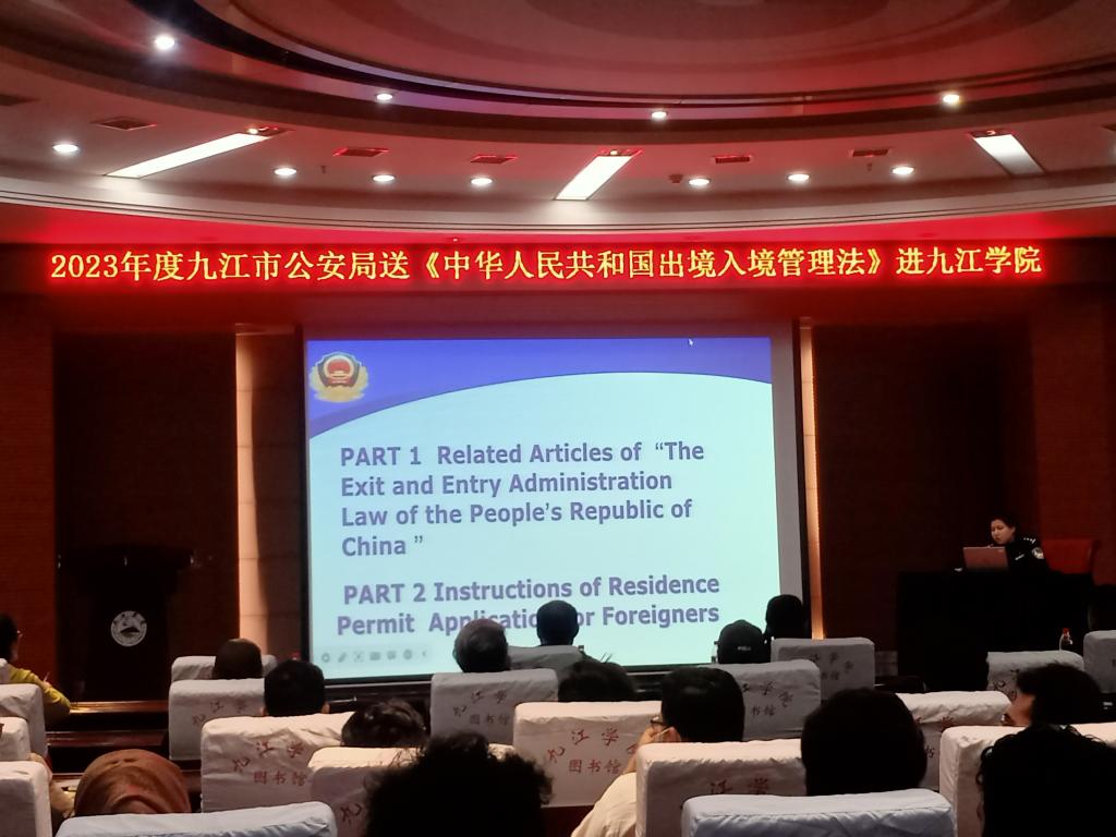 九江市公安局出入境管理处外事警官万邱姝系统讲解了《中华人民共和国出入境管理法》及《实施细则》。她介绍了留学生签证、居留许可申请手续办理以及留学生勤工助学等方面的相关规定。她用浅显易懂的语言提醒留学生应注意的事项,并对照《出入境管理法》及《实施细则》加以佐证。