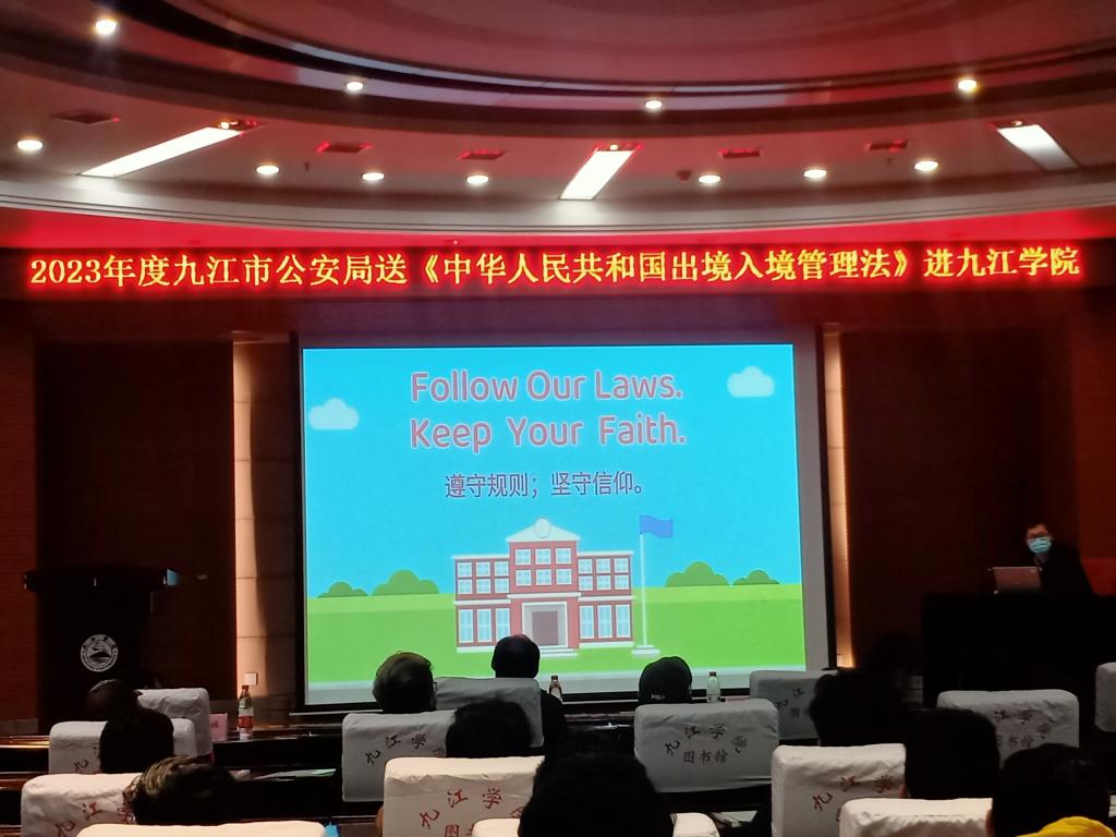 3月27日上午,我校国际交流学院邀请了九江市公安局警官来校为我校来华留学生开展了法律法规宣传专题讲座。共来自11个国家的120名来华留学生参加了本次活动。