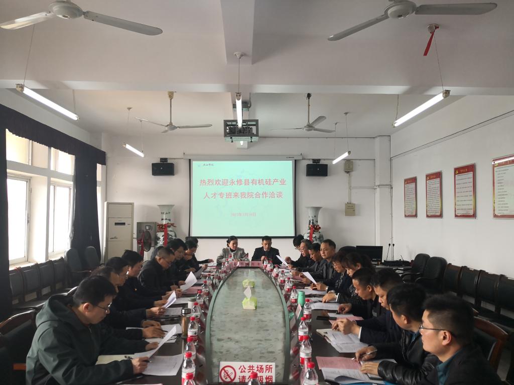 为进一步加强校地企合作,围绕打造有机硅千亿产业集群目标,壮大有机硅产业人才队伍,3月30日,永修县有机硅产业人才专班在永修县委常委、组织部长梁莉率领下一行来到我校合作洽谈,并达成一定的合作意向。