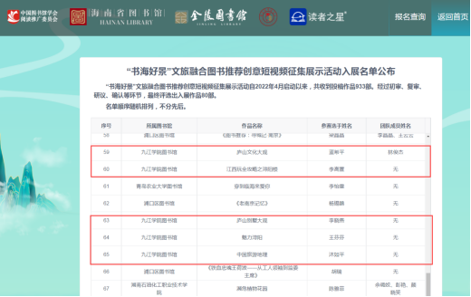 “书海好景”文旅融合图书推荐创意短视频征集展示活动 2022年4月启动以来,活动共收到全国投稿作品933部。经过初审、复审、研议、确认等环节,最终评选出入展作品80部。我校旅游与地理学院的蓝希平、李高萱、李晓燕、王芬芬和化学化工学院的沐如平等五位同学的作品入选。