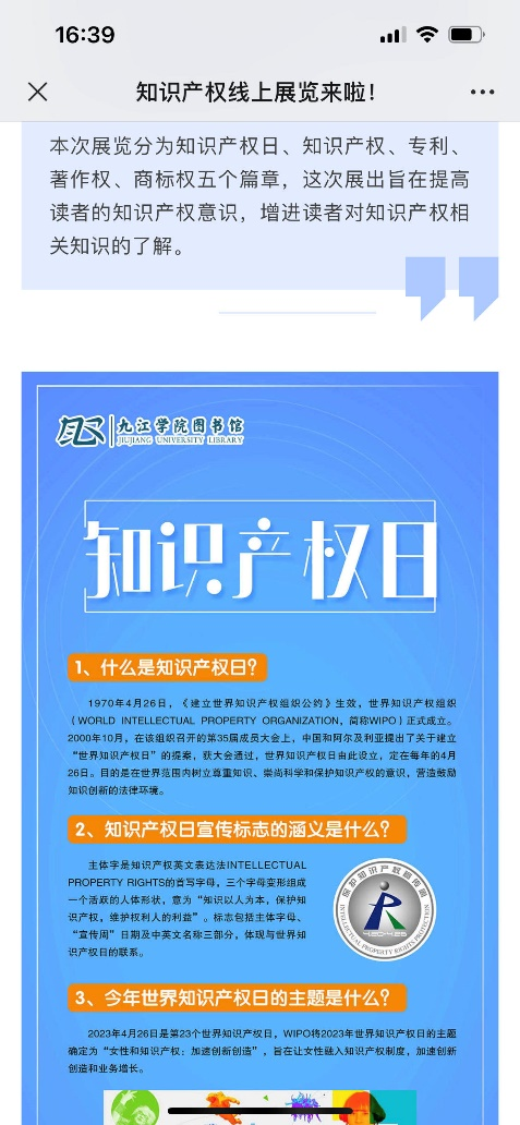 同时,图书馆在微信公众平台推出了线上展览,开拓了新的宣传渠道,扩大受众范围,加强了知识产权基本常识的普及力度。
