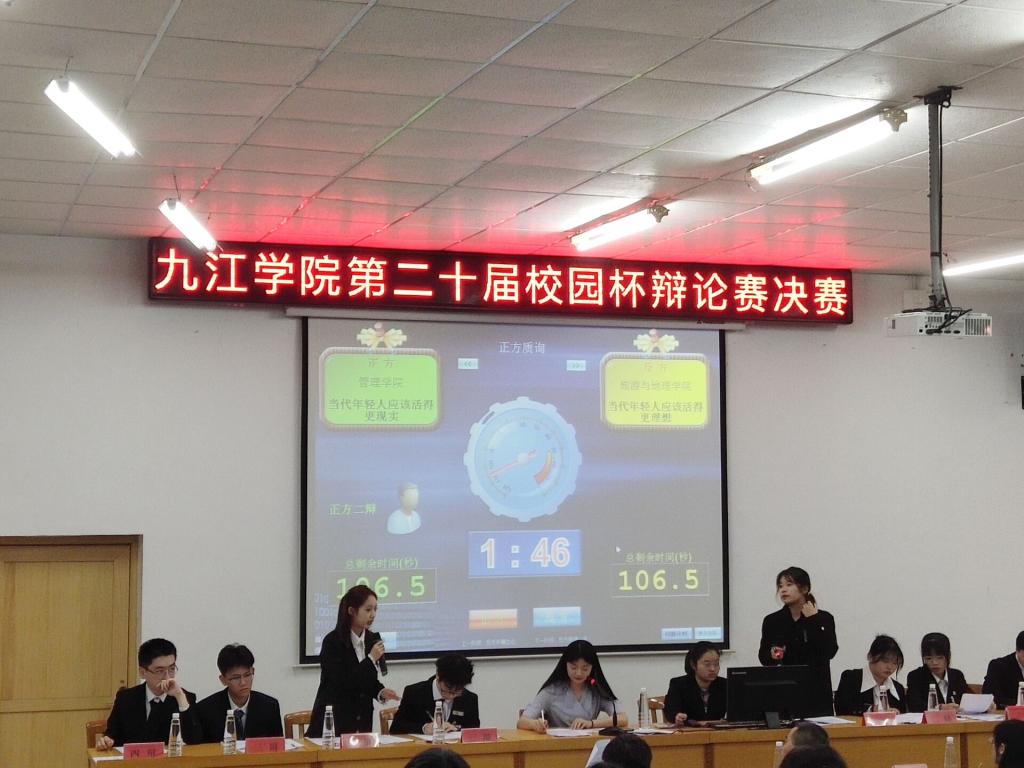 为深入学习贯彻党的二十大精神,加快建设高水平应用型大学,引导广大青年关注社会热点,强化责任担当,增强逻辑思维能力,提高语言表达能力,5月7日晚,九江学院第二十届“校园杯”辩论赛决赛在主图书馆报告厅举行,管理学院辩论队和旅游与地理学院辩论队分别作为正反双方,就“当代年轻人应该活得更现实还是更理想”这一辩题进行巅峰对决。