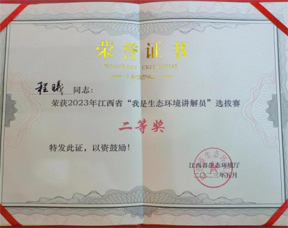 5月19日,由江西省生态环境厅主办的江西省2023年“我是生态环境讲解员”选拔赛决赛在省生态环境厅成功举行。我校资源环境学院的程曦同学从预选、初赛中脱颖而出,并在决赛中发挥出色,荣获2023年江西省“我是生态环境讲解员”选拔赛二等奖,并将作为参加生态环境部比赛的候补人选参加后期培训;同时,资源环境学院的钟锦绣、张天翔、朱益锋同学还荣获优秀剧本三等奖2项。