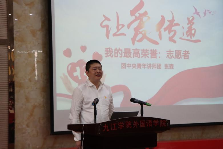 中国青年志愿者协会理事张森,动情讲述父亲生病住院治疗促使自己走上无偿捐献遗体器官志愿服务的经历,全家16人都登记了“无偿捐献遗体器官志愿书”,23年坚持献血96次、19200毫升,让全场师生嘘唏感动不已。