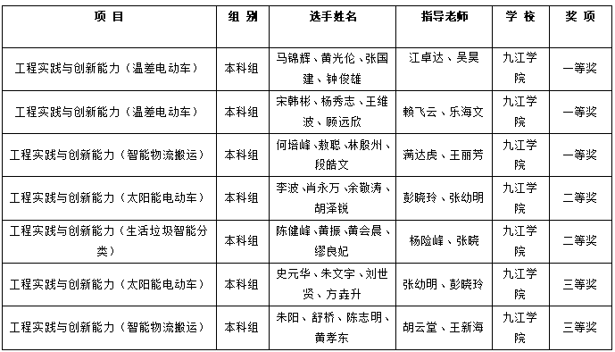 近日,由江西省教育厅主办,江西省工程训练教学学会举办,南昌航空大学承办的第七届江西省大学生工程实践与创新能力大赛暨2023年中国大学生工程实践与创新能力大赛江西省选拔赛在南昌航空大学举行。来自全省20余所本科高校的600余名师生参加。九江学院代表队获得了一等奖3项,二等奖2项,三等奖2项的好成绩。