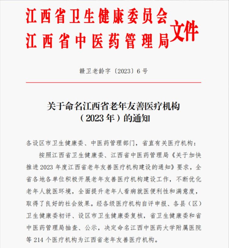 近日,江西省卫生健康委员会下发《关于命名江西省老年友善医疗机构(2023年)的通知》,九江学院附属医院获评江西省老年友善医疗机构,标志着医院医疗服务水平再上新台阶。