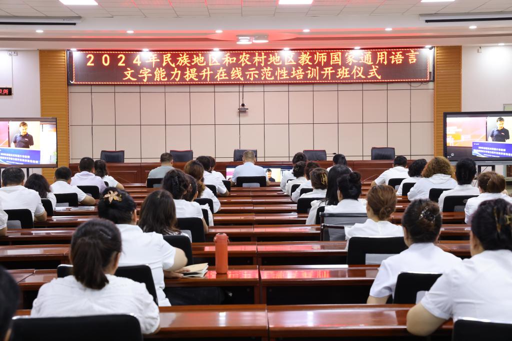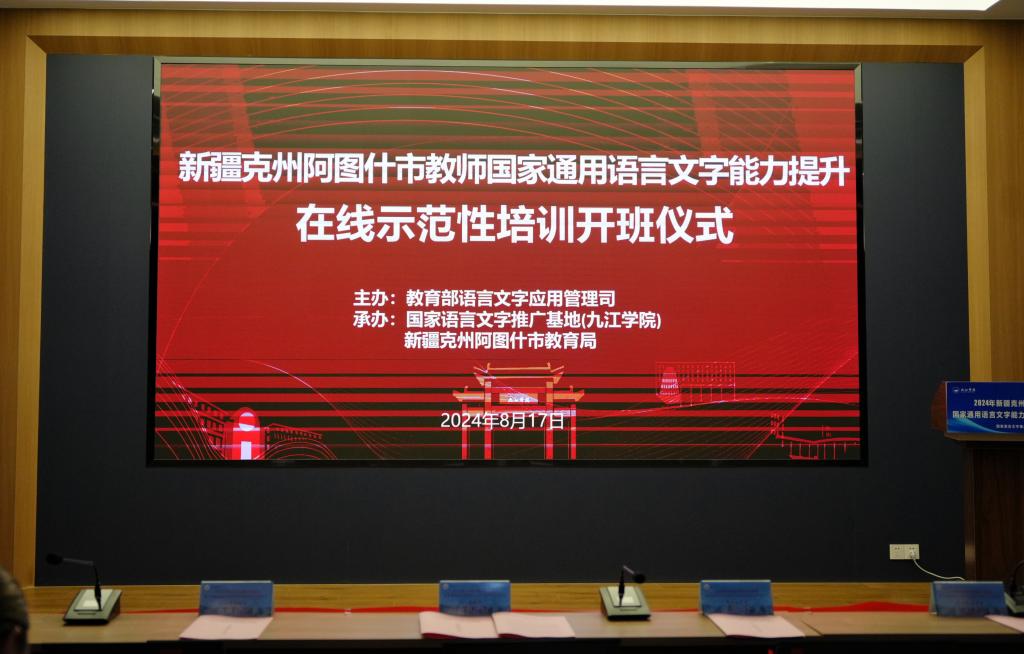 8月17日,我校举行国家语言文字推广基地对口新疆克州阿图什市教师国家通用语言文字能力提升在线示范培训班开班仪式。开班仪式以线上、线下相结合的方式同步举行。副校长、国家语言文字推广基地(九江学院)副主任李松志,阿图什市教育局党组书记、副局长马金龙出席开班仪式并讲话。