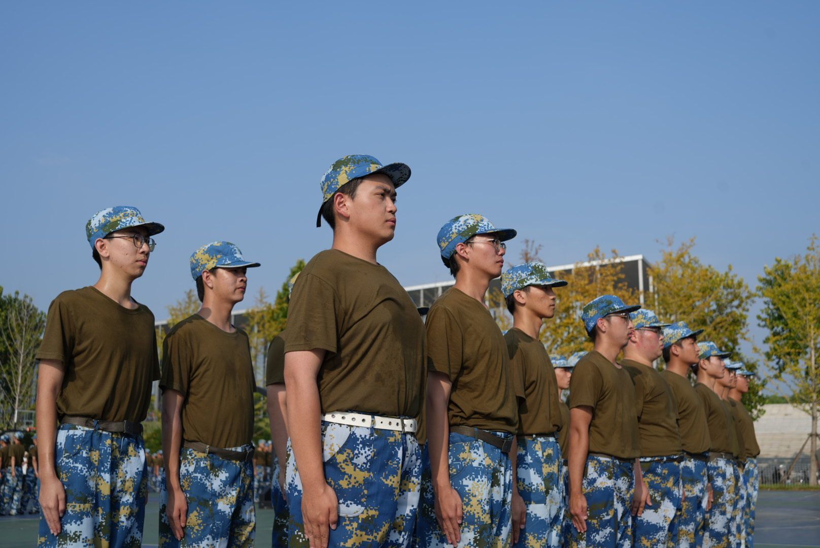 “齐步!走!”“一二一,一二一……”一排排整齐划一的队列在训练场上展开,在炎炎烈日之下,尽管汗水不停挥洒,新生们依旧斗志昂扬,步伐矫健,动作标准,声音洪亮。