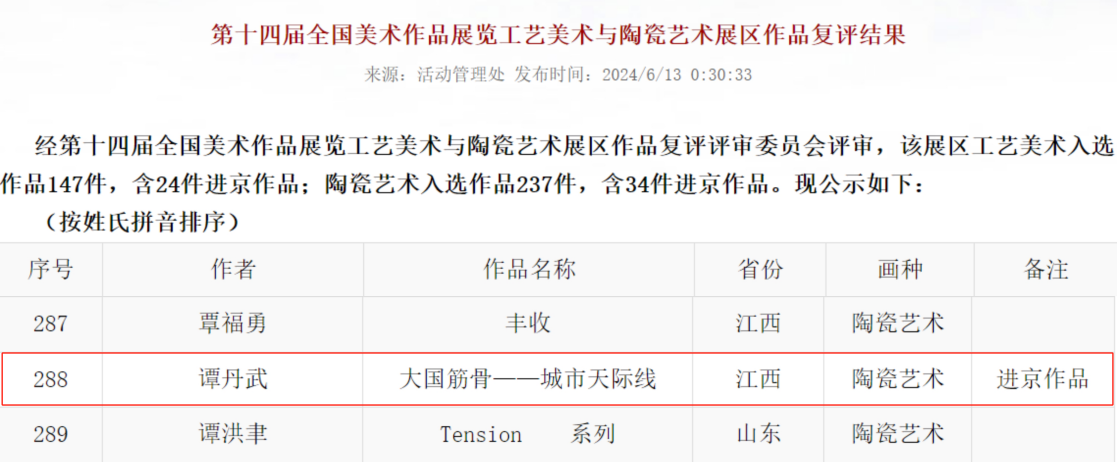 日前,第十四届全国美术作品展览进京作品展在中国美术馆和中国国家博物馆进行。在各展区的作品复评结果中,我校艺术学院谭丹武老师的陶艺作品《大国筋骨-城市天际线》成功入选,并被选为进京作品,这也是九江市在第十四届全国美展上唯一入选的进京作品。同时,艺术学院教师张甘霖的艺术作品《竹影印记》也入选本届全国美展壁画展区作品展。