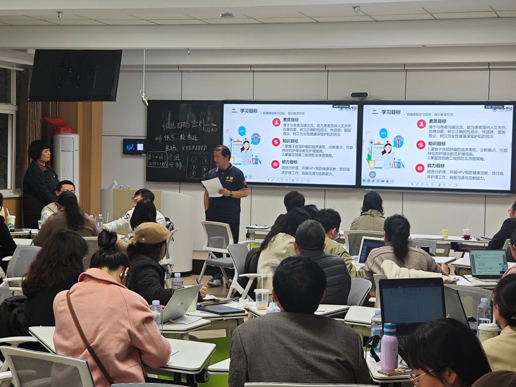 董为人教授以《基于胜任力的新时代医护课程大思政一流课堂及其设计》为题,深入剖析了新时代背景下新医科的发展趋势及医生的岗位胜任力。他结合自身丰富的教学和科研经验,详细阐述了如何培养卓越创新人才,并从思政理念、医学人文、文史哲美、时代精神、职业科学素养等多个维度,全面解读了“医护课程大思政一流课堂设计”的核心内涵和融入路径。此外,董教授还分享了“混合式教(导)+学”理念在打造新时代医护课程大思政一流课堂中的实际应用,为在场教师提供了宝贵的教学参考。
