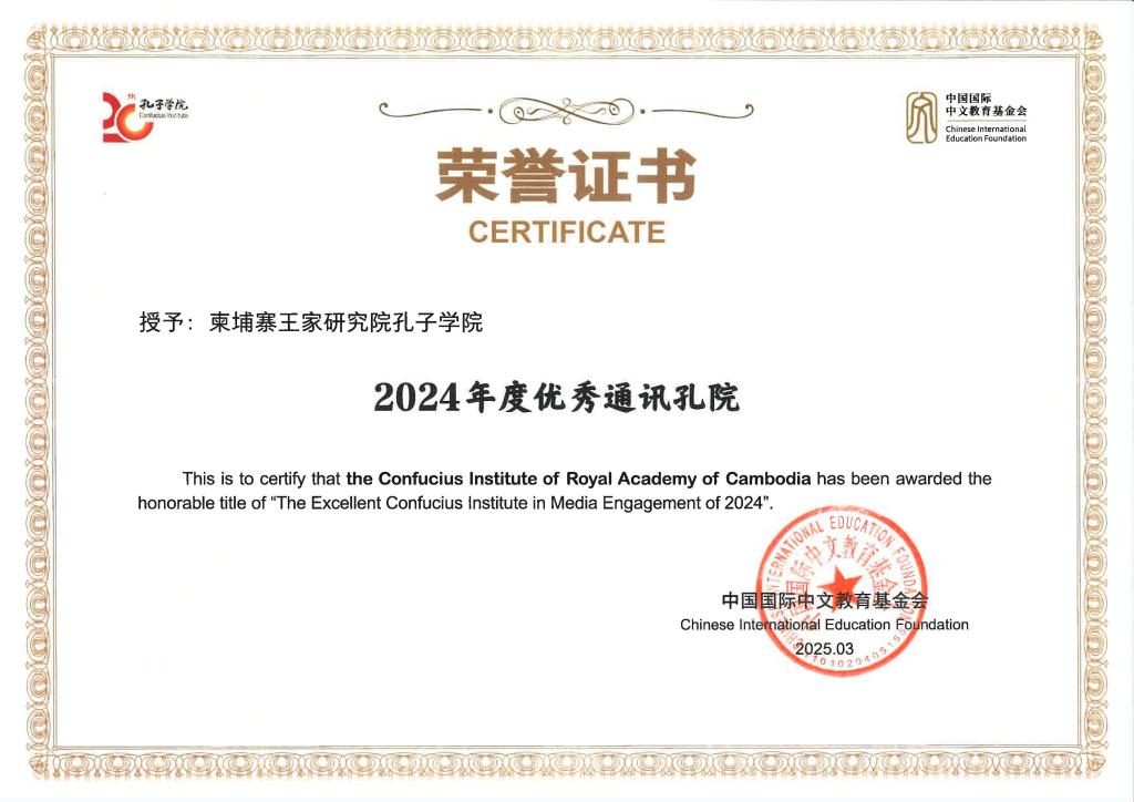 2024年,适逢孔子学院品牌创立20周年,全球孔子学院(课堂)积极开展各类活动,致力于提升孔子学院的品牌影响力。根据全球近500家孔子学院(课堂)的投稿数量、录用情况、文稿和视频的原创性等多项指标,中国国际中文教育基金会授予61所孔子学院“2024年度优秀通讯孔院”称号。我校合作设立的柬埔寨王家研究院孔子学院成为柬埔寨唯一获此称号的机构。